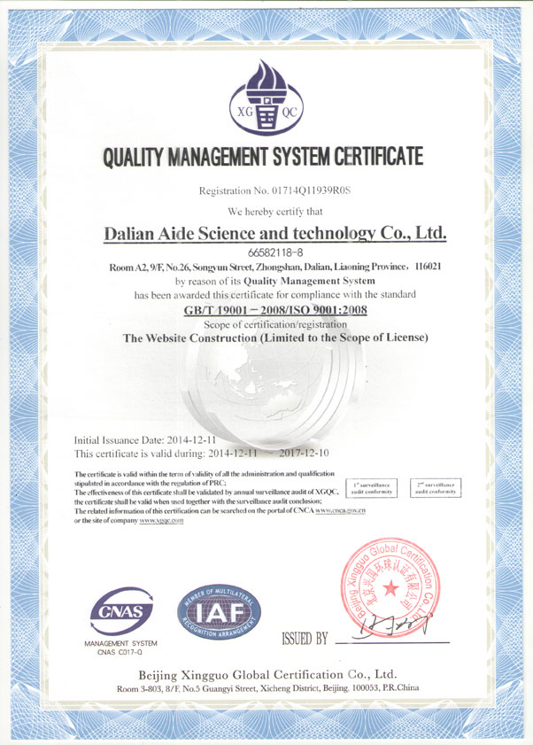 公司通過ISO90001質量管理體系,標志著公司的管理又上了一臺階,理解用戶需求,把握設計創意,嚴格管理建設流程,為更多企業更好的做好互聯網服務。